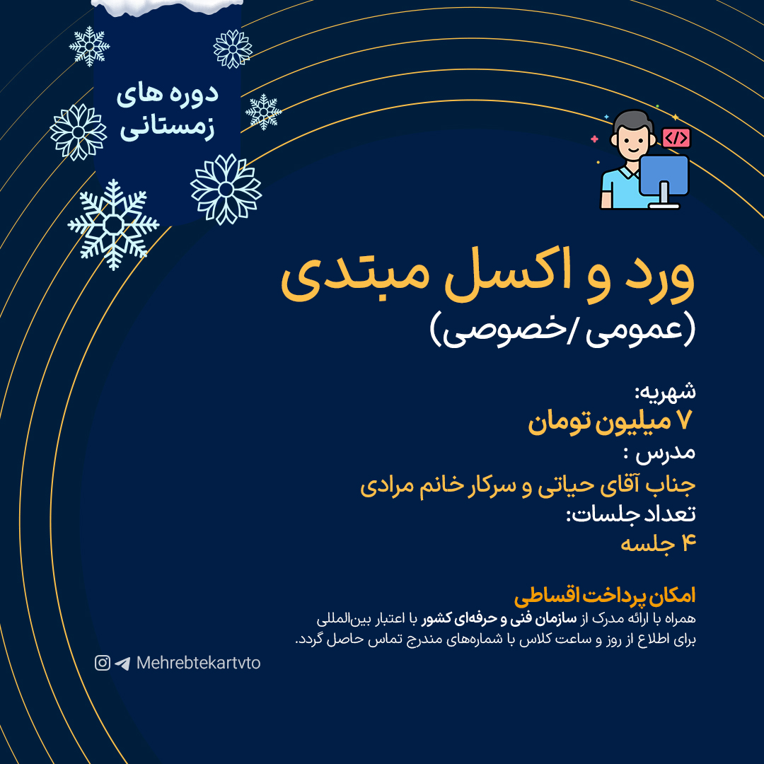 کلاس ورد و اکسل از جمله دوره های آموزشی پرطرفدار هستند که به افراد کمک می کنند تا مهارت های ضروری را در نرم افزارهای مایکروسافت آفیس یاد بگیرند. این کلاس ها برای همه افراد، از مبتدی تا حرفه ای، مناسب هستند و برای بهبود عملکرد در محیط های کاری و تحصیلی بسیار مفید می باشند