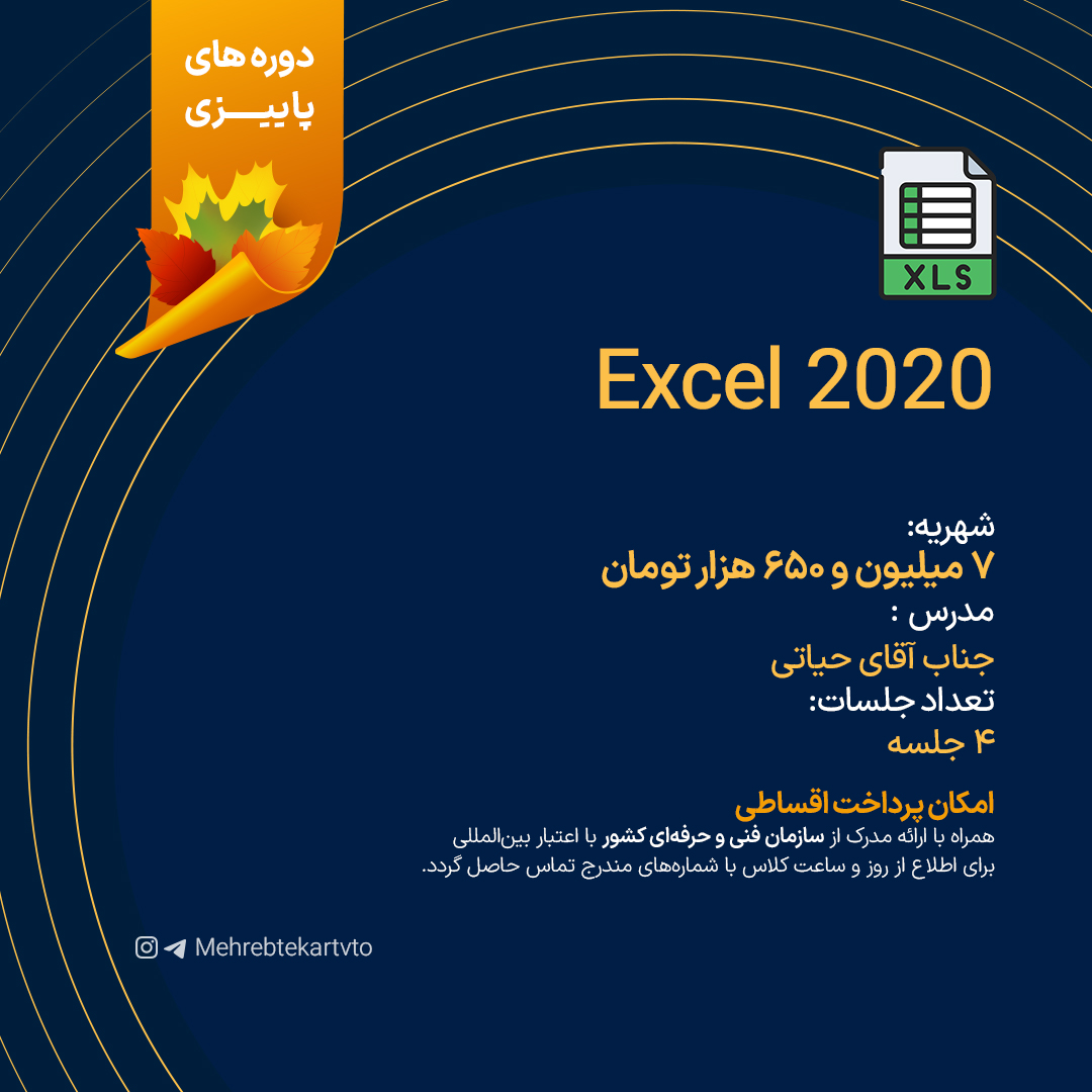 اگر به دنبال یادگیری مهارتهای اکسل 2020 و افزایش کارایی خود در محیطهای کاری و حرفهای هستید، دوره آموزشی Excel 2020 مهرابتکار میتواند انتخاب ایدهآلی برای شما باشد. این دوره بهطور خاص برای افرادی طراحی شده است که میخواهند از اکسل بهطور کامل بهرهبرداری کنند و مهارتهای خود را در تحلیل دادهها، مدیریت پروژهها و تهیه گزارشهای حرفهای بهبود بخشند.