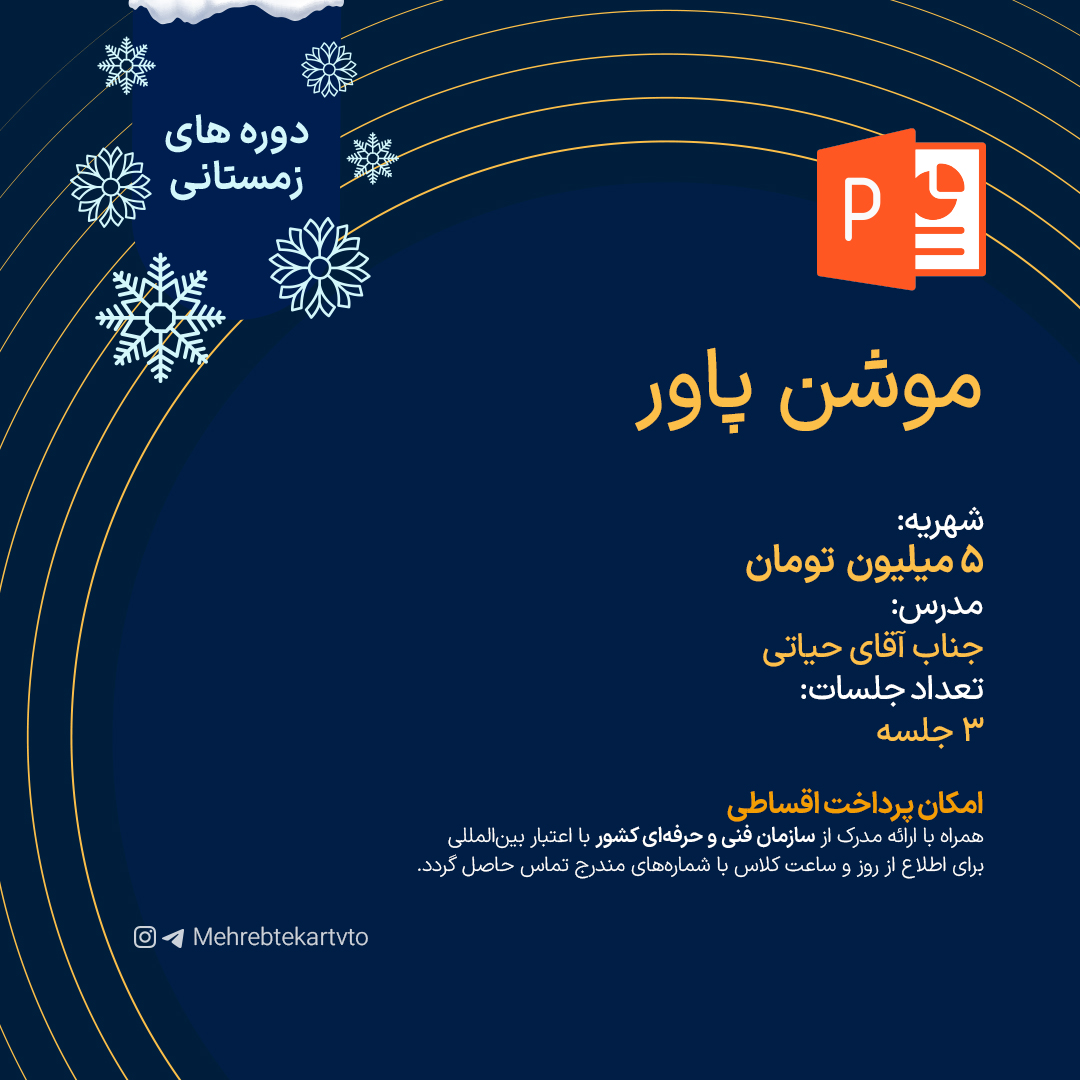 اگر بهدنبال یک مسیر شغلی نو، خلاقانه و پردرآمد هستی، وقتشه که قدم اول رو برداری! برای ثبتنام در دوره موشن پاور، بعد از وارد شدن به سایت آموزشگاه مهرابتکار و انتخاب دوره مربوطه و یا تماس با ما وارد دنیای حرفهای موشن گرافیک بشید.