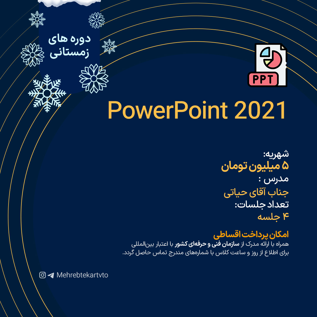 یکی از نرمافزارهای پرکاربرد مایکروسافت آفیس، نرمافزار پاورپوینت است که برای ساخت ارائههای متنی-بصری استفاده میشود. بسیاری از دانشجویان، اساتید، کارمندان و سخنرانان برای ارائه مطالب، مقالات، گزارشها یا پروژههای خود از این نرمافزار قدرتمند استفاده میکنند. با استفاده دوره آموزشی PowerPoint 2021 میتوانید اسلایدهایی جذاب و خلاقانه شامل متن، تصویر، ویدئو، جدول، نمودار و حتی صدا طراحی کرده و تاثیرگذاری ارائه خود را چند برابر کنید.