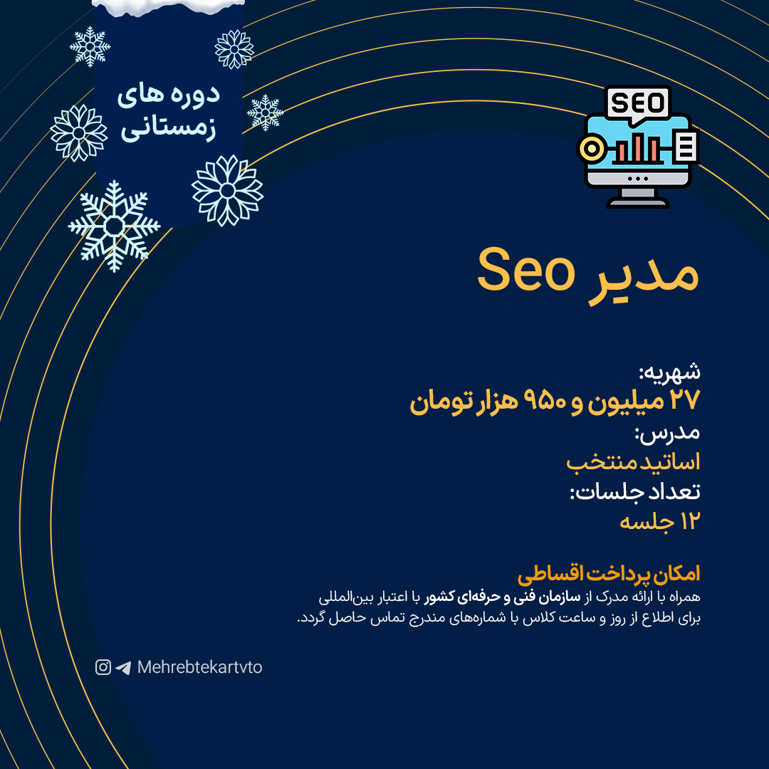 آیا دوست دارید وبسایت خود یا مشتریانتان را به صدر نتایج گوگل برسانید؟ آیا میخواهید با تسلط بر تکنیکهای سئو، در دنیای دیجیتال پیشرو باشید؟ دوره آموزشی مدیر SEO مهرابتکار دقیقاً همان چیزی است که برای تبدیل شدن به یک متخصص سئو حرفهای نیاز دارید. این دوره با رویکردی کاملاً کاربردی طراحی شده تا شما را از مفاهیم پایه تا استراتژیهای پیشرفته سئو همراهی کند. این دوره جامع، ترکیبی از دو دوره سئو مقدماتی و پیشرفته است و تمامی سرفصلهای آموزشی، کاربردی طراحی شدهاند. آنچه مهارتآموز در این دوره با تمرین و پروژههای عملی و کاربردی میآموزد، مجموعه مهارتهایی است که بازار کار، از متخصص سئو سایت میخواهد. در پروژهی نهایی، مهارتآموزان آموختههایشان را برای سئوی یک سایت واقعی پیاده و اجرا میکنند. در تمامی مسیر آموزش نیز، مدرس دوره همراه مهارتآموزاناند و نفرات برتر برای دوره کاراموزی سئو انتخاب میشوند.